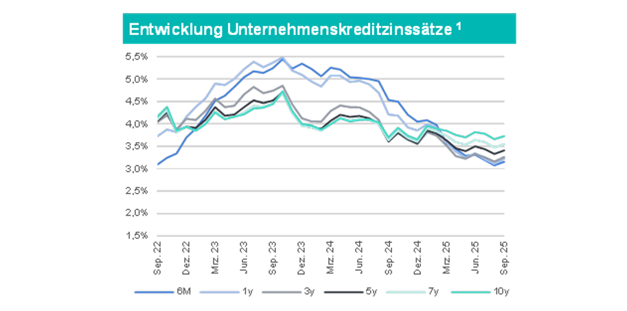 Die EZB hat die Leitzinsen zuletzt konstant belassen. Aufgrund der stabilen (Kern-)Inflation und heterogenen Inflationsentwicklung in der EU halten wir eine EZB-Leitzinssenkung in der letzten EZB-Sitzung des Jahres 2025 für unwahrscheinlich. Infolge der nach wie vor schwachen wirtschaftlichen Entwicklung und des Drucks auf Bonitäten / Ratings mit den Jahres- / Konzernabschlüssen 2024 setzt sich die restriktive Kreditvergabe der Banken weiter fort. Für kleine und mittelständische Unternehmen ist weiterhin ein hoher Stand der KfW-ifo Kredithürde ausgewiesen. Für Q4 2025 erwarten wir nahezu stabile Unternehmenskreditzinsen über alle Laufzeitbänder. Weiterhin werden die geopolitischen Unsicherheiten und die schwache makroökonomische Lage nicht helfen, das Finanzierungsumfeld deutlich zu entspannen. Eine massive Verbesserung der Bonitäten / Ratings mit den Jahres- / Konzernabschlüssen 2025 ist bei vielen Unternehmen ebenfalls nicht zu erwarten. Es ist entsprechend unverändert von längeren und schwierigen Finanzierungsverhandlungen sowie hohen Anforderungen der Finanzierer für Unternehmen in schwierigen Branchen und / oder ohne Investment Grade Rating auszugehen.