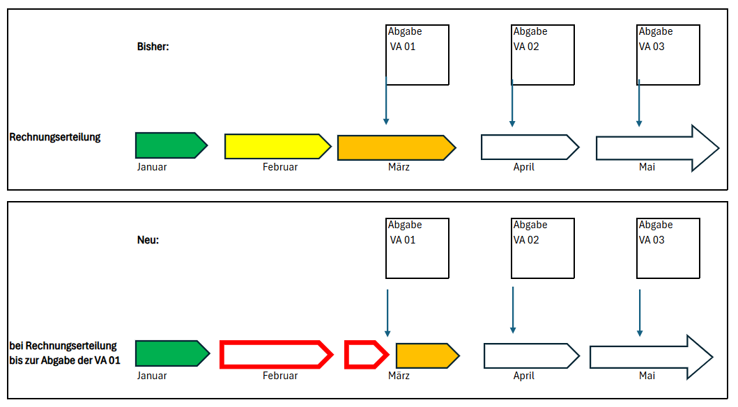 Die Unterschiede zwischen bisheriger Situation und der Lage, wie sie sich nach dem EuG-Urteil darstellt, lassen sich in einem Beispiel mit Dauerfristverlängerung und Leistungszeitraum Januar illustrieren: